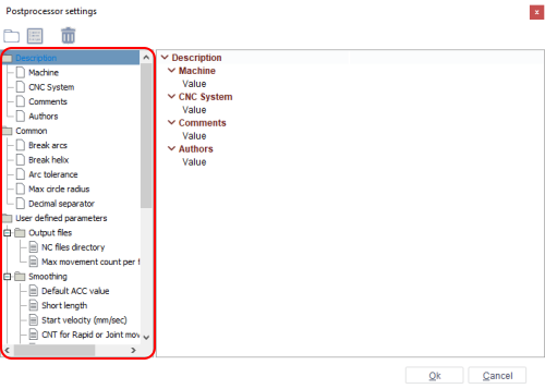 - User defined parameters - they are a list of additional properties designed by the developer of exact postprocessor, which are shown to the user of postprocessor and which he must fill before starting the generation of G code. For example, the path to an output file, program name or number, employee name, etc.