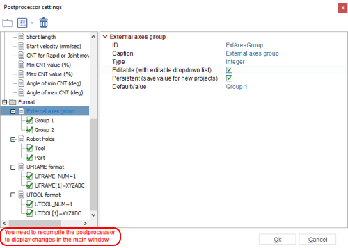After each change and move of the parameter, a warning will appear in the lower left part of the window: "You need to recompile the postprocessor to display changes in the main window".