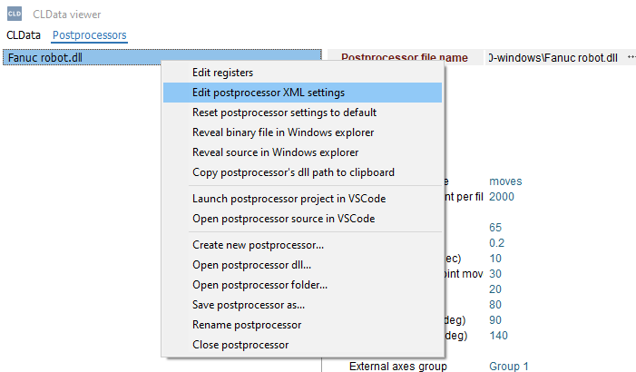 Postprocessor settings window allows you to work with xml settings of postprocessor the most convenient way. In order to open the window, you need to select a postprocessor in CLDViewer, right-click on it. After that click on Edit postprocessor XML settings in the context menu.
