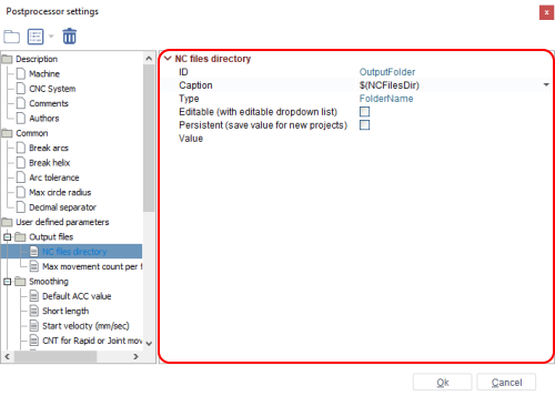 - $(NCProgNumber). These variables allow you to make a translatable name (localization). Also it allows generating some default values depending on the meaning of the parameter, for example, NC files are stored by default in the folder specified in the CAM system settings.