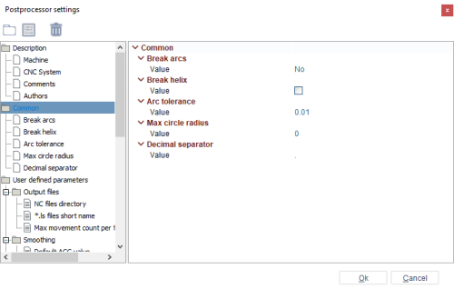 - Common properties which defines the way how to handle some frequently encountered cases. For example, should it break circular arc movements to lines, halves or quarters.